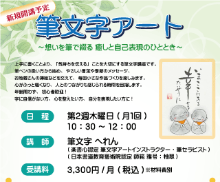 上手に書くことより、「気持ちを伝える」ことを大切にする筆文字講座です。 筆ペンの扱い方から始め、やさしい言葉や季節のメッセージ、お地蔵さんの挿絵などを交えて、毎回小さな作品づくりを楽しみます。 心がふっと軽くなり、人とのつながりも感じられる時間を目指します。 年齢問わず、初心者歓迎!字に自信がない方、心を整えたい方、自分を表現したい方に!